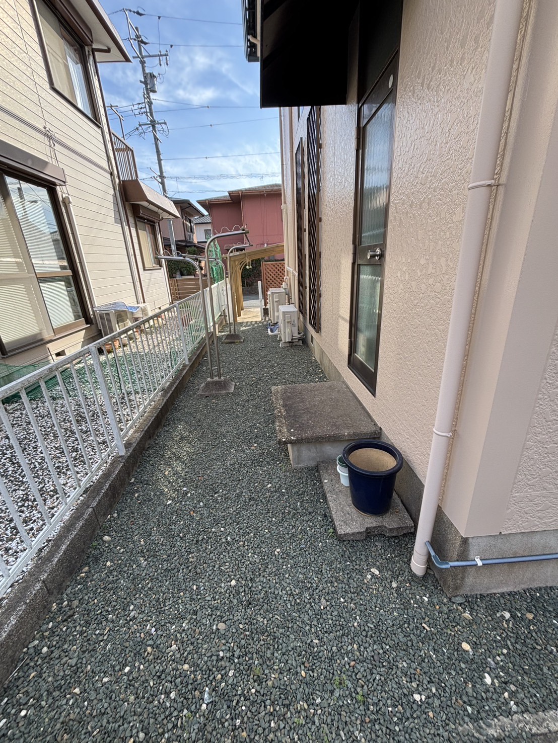 アプローチにB-Lifeのフリーフロア施工と防草シートの上に白玉砂利